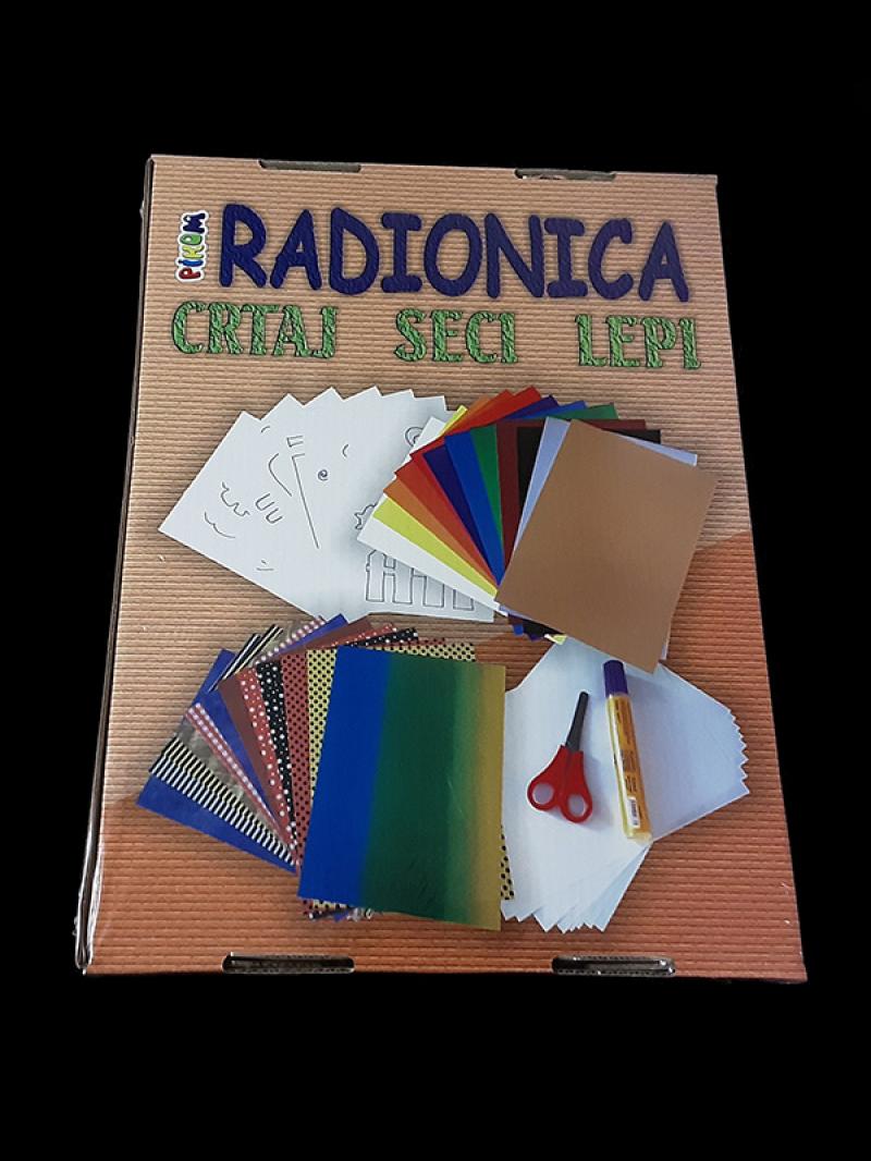 RADIONICE crtaj seci lepi ŠUMA Uzrast: 5-10 ; Format kutije: 22x31x5cm; Sadržaj: Komplet koji sadrži lepak, makazice, kolaž papire, šablobne,podlogu za pravljenje postera na zadatu temu