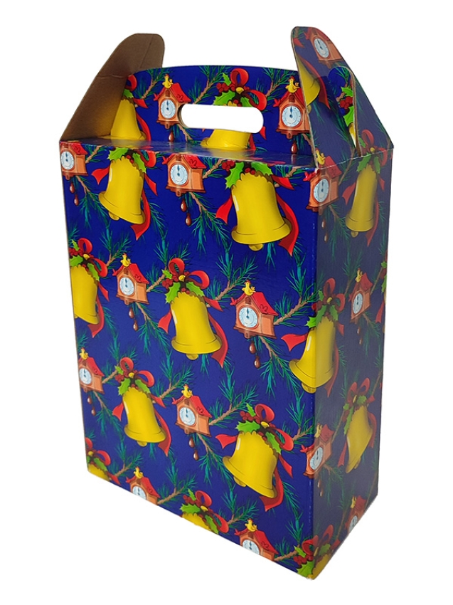 Zapremina za pakovanje u kutiju je 23x28,5x11cm, ručke su dodatak. Kutija je tvrda kada se sklopi izradjena od kaširanog mikrovala, 150 gr štampanim i lakiranim kundstrukom. Kutija se šalje rasklopljena.